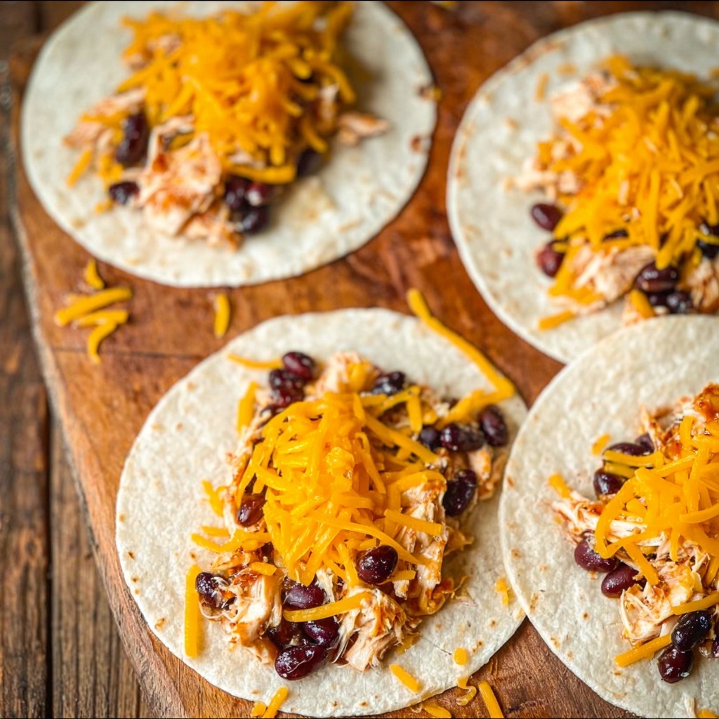 Lay out your corn tortillas and distribute the chicken mixture evenly among them. Then sprinkle shredded cheddar cheese on top to add that melty, savory layer that will hold your taquitos together when cooked.