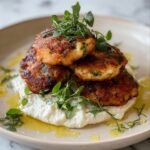 Deliciously crispy artichoke fritters served warm with a smooth and tangy whipped goat cheese topping. These golden fritters combine tender artichoke hearts with a seasoned batter, fried to perfection for a crunchy exterior and soft interior. The whipped goat cheese adds a creamy, slightly tangy contrast, making this appetizer perfect for sharing or a delightful snack.