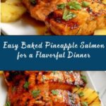 This Baked Pineapple Salmon recipe features tender salmon fillets baked with a delicious tropical marinade of pineapple juice, soy sauce, honey, garlic, and ginger. Topped with fresh pineapple chunks and garnished with green onions and sesame seeds, this easy-to-make dish combines savory and sweet flavors perfect for a healthy and flavorful dinner.