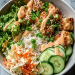 This Bang Bang Chicken Bowl is a quick and flavorful meal featuring crispy pan-fried chicken tossed in a spicy, creamy sauce, served over fragrant jasmine rice with fresh vegetables like lettuce, cucumber, and carrots. Perfect for a satisfying weeknight dinner, this dish balances crunchy textures with a sweet and spicy kick.