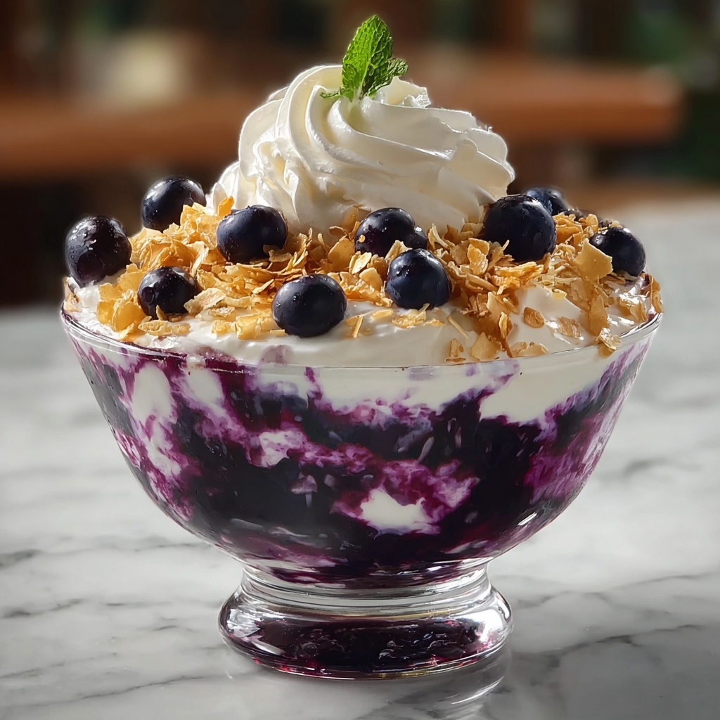 Top your trifle with fresh blueberries and a generous dollop of whipped cream if you like. Then place it in the refrigerator for at least one hour—this chilling time allows the flavors to meld together beautifully for that perfect indulgence.