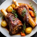 For a stunning presentation, serve the shanks whole on a large platter surrounded by the colorful root vegetables and a drizzle of the pomegranate-infused sauce. Try layering the sauce and vegetables beneath the shank for an elegant stacked effect, or plate each serving over a swirl of mashed potatoes to catch every drop of the glorious braising liquid.