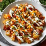This Buffalo Chicken Roasted Potato Bake combines tender chicken, crispy roasted potatoes, and a spicy buffalo sauce blend, all topped with melty cheddar and Monterey Jack cheeses. It’s a hearty, flavorful casserole perfect for game day or a comforting family dinner, served with cool sour cream and green onions for garnish.