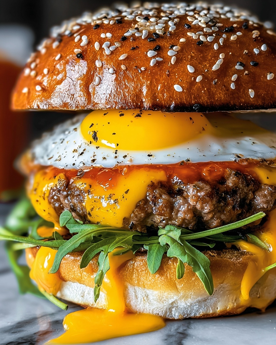 - Serve Immediately: Serve your burgers right away to enjoy the perfect combination of warm patties, melted cheese, and creamy avocado paired with the runny egg and flavorful sauce.