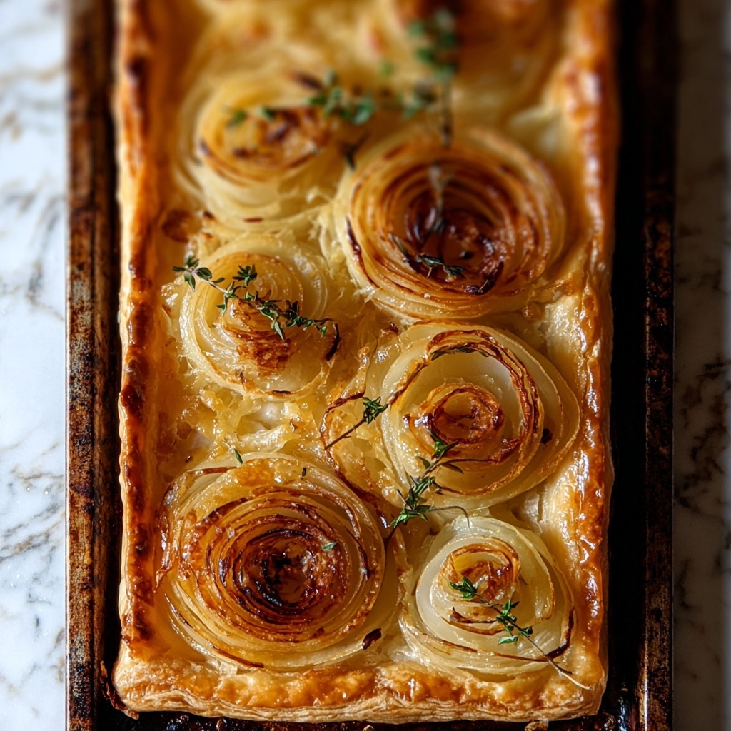 This Caramelized Onion and Gruyère Tart combines a flaky puff pastry base with sweet, deeply caramelized onions and nutty Gruyère cheese, all topped with aromatic fresh thyme. Baked to golden perfection, this savory tart is ideal for a flavorful appetizer or light meal.