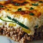 A comforting Cheesy Beef and Zucchini Casserole featuring tender ground beef sautéed with zucchini, onions, and garlic, all baked with a blend of mozzarella and cheddar cheeses for a rich and flavorful meal perfect for easy weeknight dinners.