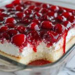 Pour the cherry pie filling evenly over the cake mixture, making sure every corner is covered with those juicy, sweet cherries that give this dessert its signature burst of flavor and festive color.