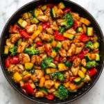 A vibrant and healthy Chicken and Vegetables Skillet recipe featuring tender chicken breast pieces sautéed with fresh broccoli, zucchini, bell peppers, and onions, all seasoned with a flavorful blend of herbs and spices. This quick and easy one-pan meal is perfect for a nutritious weeknight dinner.