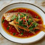 Carefully remove the fish from the steamer, mindful that it’s delicate and tender. Garnish generously with scallion greens, slices of red chili for a pop of color, and fresh cilantro leaves if you like. Pour some of the steaming liquid over the fish to keep it moist and flavorful before serving immediately for maximum enjoyment.
