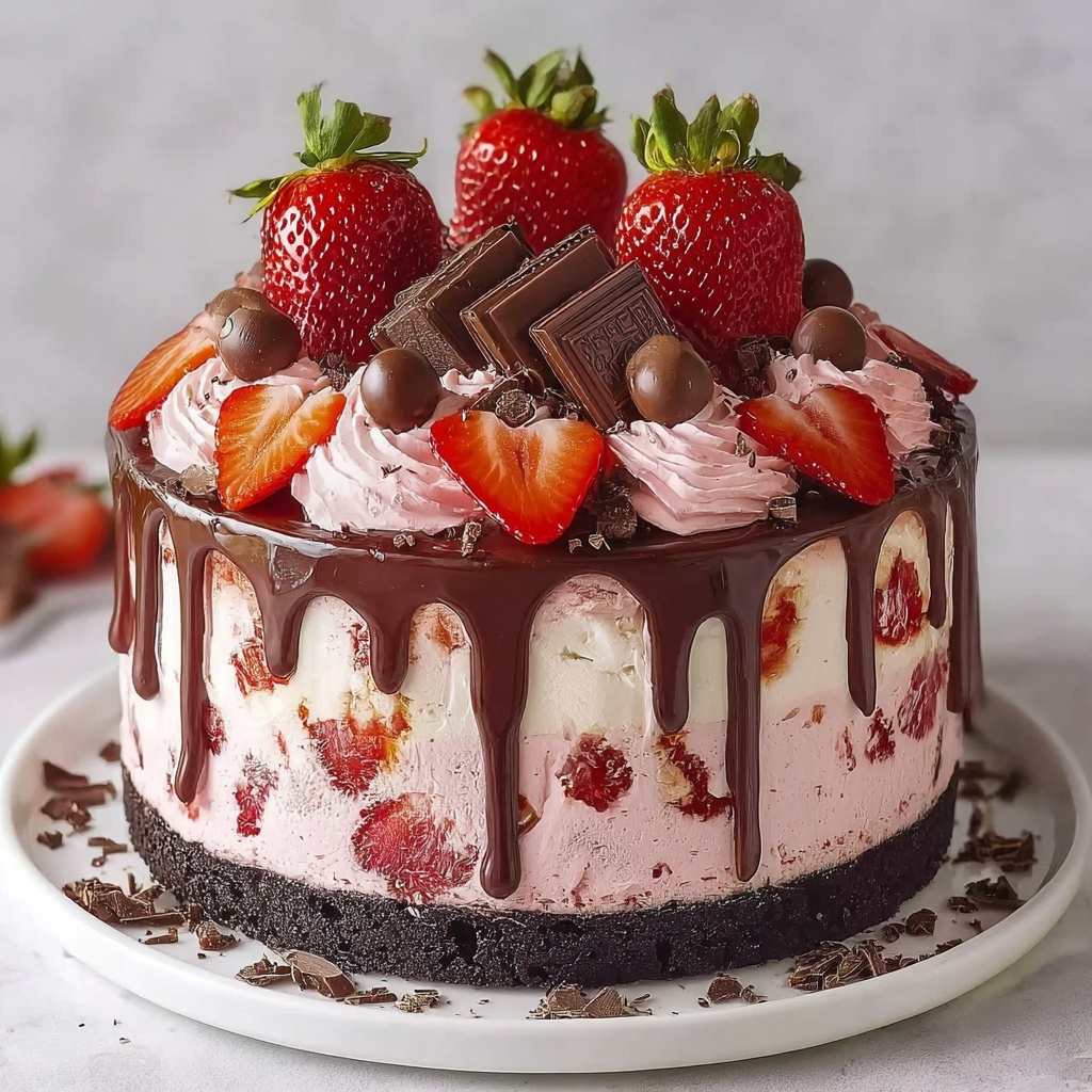 Decorate your masterpiece with sliced fresh strawberries and chocolate shavings for a touch of elegance and freshness that complements the rich chocolate and strawberry ice cream flavors. Freeze the completed cake for at least 1 hour before serving to help the ganache set and the layers meld beautifully.