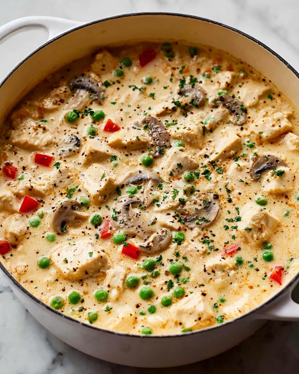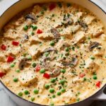 Classic Chicken a la King is a creamy, comforting dish featuring tender chicken, mushrooms, peas, and pimientos in a rich white sauce made with butter, flour, chicken broth, milk, and a touch of cream. Perfectly seasoned and served hot over rice, pasta, toast, or biscuits, this recipe is a timeless favorite for a quick and satisfying meal.
