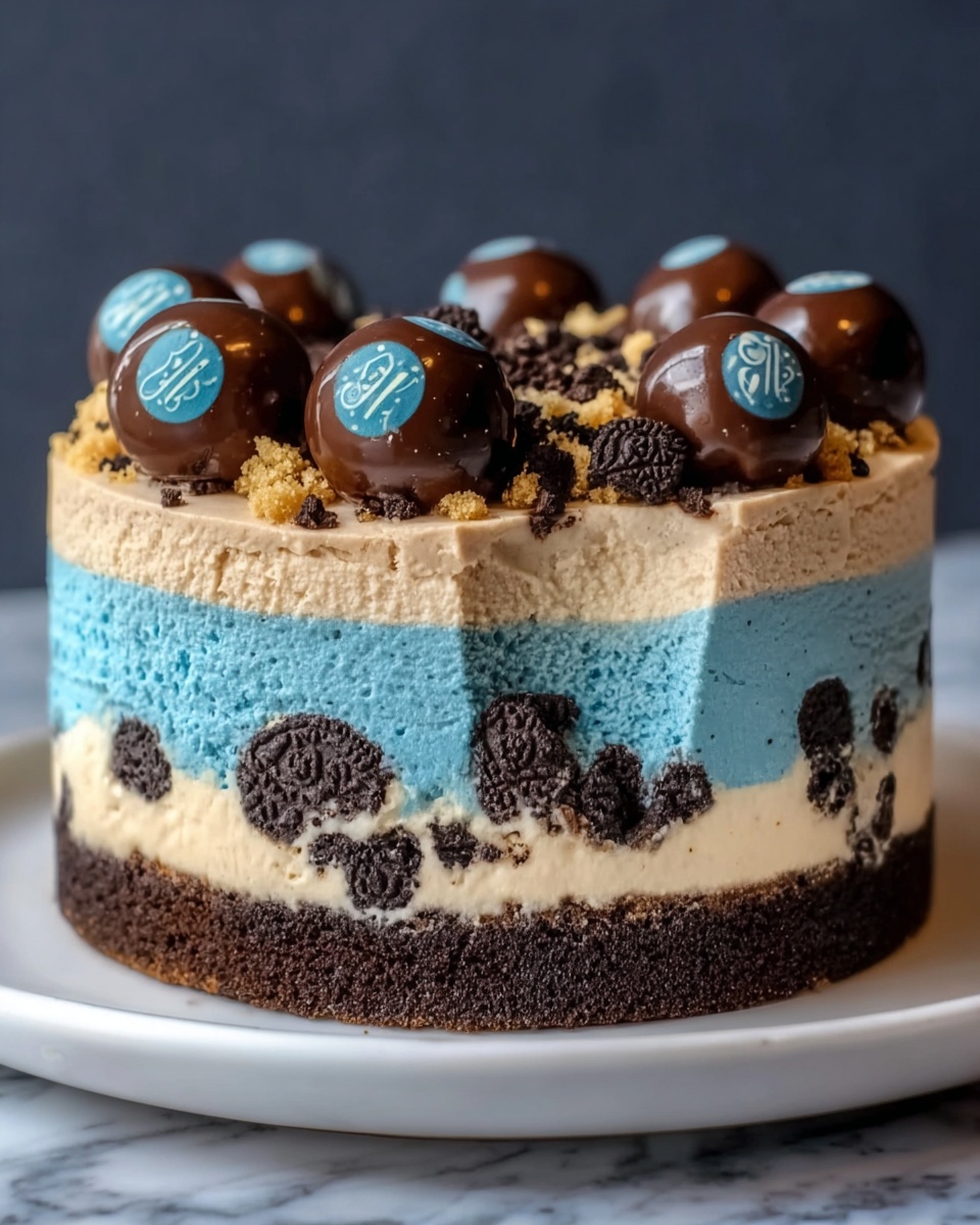 Cookie Monster Cheesecake is a playful and indulgent dessert combining a rich chocolate chip cookie blondie base topped with a creamy, vibrant blue cookies and cream cheesecake layer. Finished with luscious chocolate ganache and decorated with an assortment of mini chocolate chip cookies, this treat is perfect for special occasions or any time you want a fun and flavorful dessert.