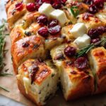 This Cranberry Brie Sourdough Pull-Apart Bread is a deliciously festive appetizer perfect for holiday gatherings or cozy nights in. A crusty sourdough loaf is sliced in a crosshatch pattern and filled with creamy Brie, tangy cranberry sauce, and fragrant rosemary, then baked until golden and melty. The buttery topping adds richness, making each pull-apart piece a delightful mix of savory, sweet, and herbal flavors.