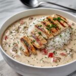 This Creamy Cajun Chicken & Rice recipe combines tender chicken pieces seared with bold Cajun seasoning, sautéed vegetables, and long-grain white rice cooked to perfection in a velvety blend of chicken broth, heavy cream, and Parmesan cheese. It’s a comforting, flavorful, one-skillet meal perfect for a satisfying dinner with family or friends.