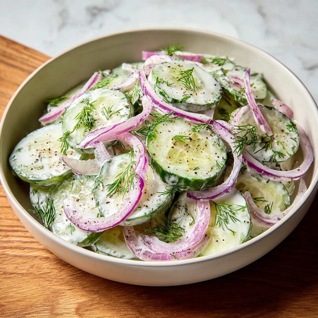 This creamy cucumber salad is a refreshing and tangy side dish perfect for summer gatherings or a light meal. Made with thinly sliced cucumbers and red onions, tossed in a flavorful sour cream and dill dressing, it combines crisp textures with a smooth, herbaceous finish. The dish requires no cooking and is quick to prepare, making it an ideal no-fuss addition to any menu.