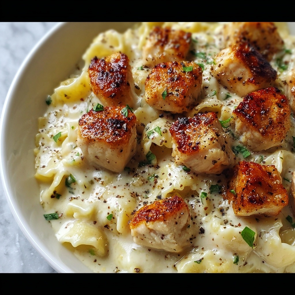 This Creamy Parmesan Pasta with Garlic Butter Chicken Bites is a comforting and flavorful dish featuring tender chicken cooked in garlic butter, combined with a rich, creamy Parmesan sauce tossed with your choice of pasta. Perfect for a satisfying weeknight dinner, it balances rich creaminess with aromatic garlic and Italian herbs, finished with a fresh parsley garnish.