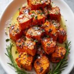 Delight in these Crispy Baked Sweet Potato Bites, perfectly seasoned with garlic, smoked paprika, and sea salt, then topped with a fragrant Parmesan herb butter. This easy-to-make side dish offers a healthy twist with crispy edges and a rich, buttery herb finish, ideal for snacks or meals.