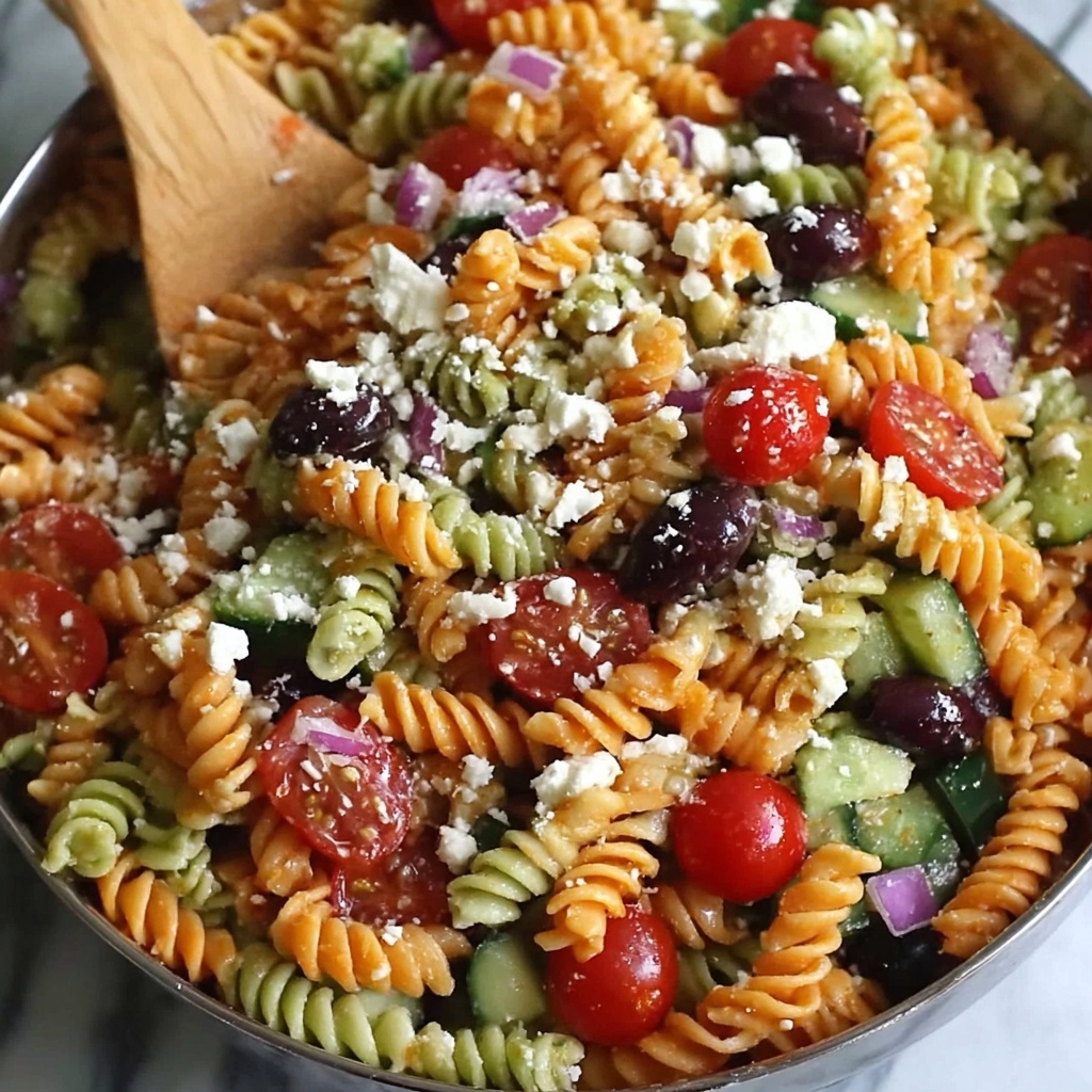 This Easy Italian Pasta Salad is a quick and refreshing side dish featuring tricolor rotini pasta, crisp cucumbers, juicy tomatoes, tangy feta cheese, and black olives, all tossed in flavorful Italian dressing. Perfect for picnics, potlucks, or a light meal, it can be prepared in just 15 minutes and is delicious served chilled.