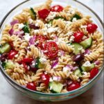 This refreshing Feta & Tomato Pasta Salad is a vibrant, Mediterranean-inspired dish perfect for gatherings and potlucks. Featuring tender orzo pasta tossed with juicy Roma tomatoes, crisp green onions, creamy crumbled feta, and a zesty lemon-olive oil dressing seasoned with Greek herbs, it’s an easy no-cook salad to prepare ahead and serve chilled.