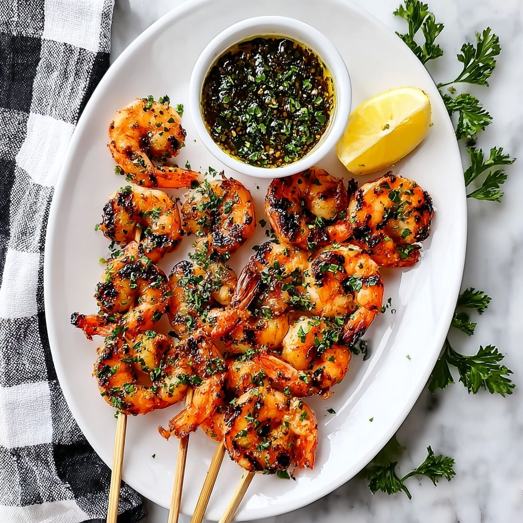 A sprinkle of freshly chopped cilantro or parsley brightens up the plate and complements the flavors perfectly. For an extra pop, add lemon wedges for guests to squeeze on their skewers, delivering a fresh burst of citrusy zing that lifts the garlicky shrimp beautifully.