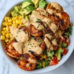 - Assemble the Bowls: Divide prepared corn salsa evenly between serving bowls. Top with grilled shrimp and sliced or mashed avocado. Drizzle generously with creamy garlic sauce and garnish with sesame seeds and chopped green onions for added freshness and crunch.