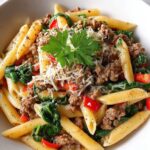 A delicious high-protein creamy beef pasta made with whole wheat pasta, lean ground beef, and a rich, healthy sauce combining low-fat cream cheese and Greek yogurt. This hearty dish is packed with nutritious ingredients like spinach and bell peppers, perfect for a comforting yet balanced meal in just 45 minutes.