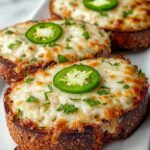 - Garnish and serve: Remove the bagels from the oven and immediately garnish each half with thinly sliced jalapeño rings for an extra kick and attractive presentation. Serve warm and enjoy!