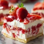 A deliciously creamy and fruity no-bake dessert featuring layers of graham cracker crust, cream cheese mixture, vanilla pudding, and strawberry Jello with fresh strawberries. Perfect for a refreshing summer treat or any occasion where a cool, easy-to-make dessert is desired.