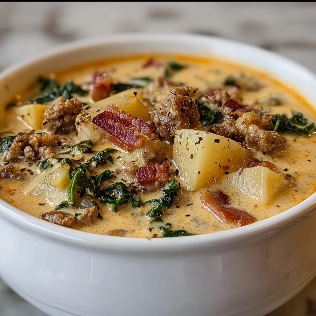 This Olive Garden Zuppa Toscana Soup recipe is a hearty and comforting Italian-inspired soup featuring savory Italian sausage, crispy bacon, tender potatoes, and nutritious kale in a creamy broth. Perfect for a cozy meal, this soup blends rich flavors with a satisfying texture, making it a family favorite.