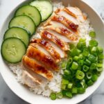 The simple garnish of freshly sliced cucumbers offers a crisp, cooling contrast that cuts through the richness of the chicken and rice. The green onion oil drizzled on top provides aromatic indulgence and a silky mouthfeel that transforms every forkful into an elegant experience.