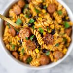 This One Pot Mexican Pasta is a flavorful and easy-to-make dish combining spicy jalapeno sausage, fire roasted tomatoes, black beans, and corn with tender rotini pasta, all simmered together in a creamy, cheesy sauce. Perfect for a comforting weeknight dinner that requires minimal cleanup.