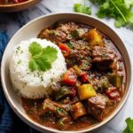 This Persian Inspired Herb and Beef Stew with Rice is a hearty and aromatic main course featuring tender beef cubes simmered with a fragrant blend of fresh herbs, spices, and kidney beans. Inspired by the traditional Persian dish Ghormeh Sabzi, this stew combines savory flavors with healthy ingredients, perfectly served over fluffy basmati rice for a comforting and satisfying meal.