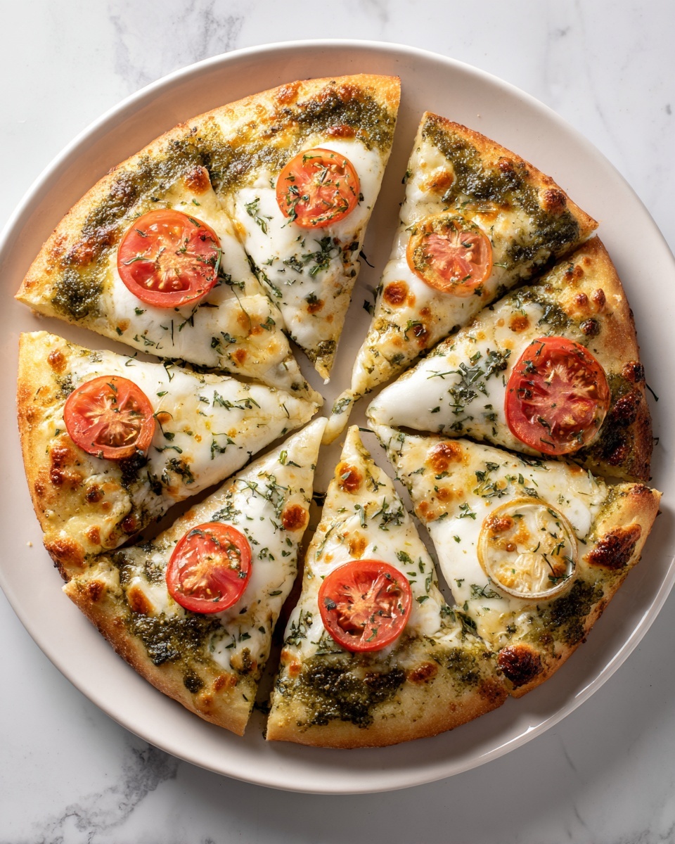 Adding extra pesto as a drizzle over the baked pizza or sprinkling some shredded parmesan right before serving amplifies the dish’s flavor and presentation. For those who love a bit of heat, red pepper flakes are an excellent option. Fresh basil leaves add an herbaceous pop and a lively touch of green that’s both fresh and visually pleasing.