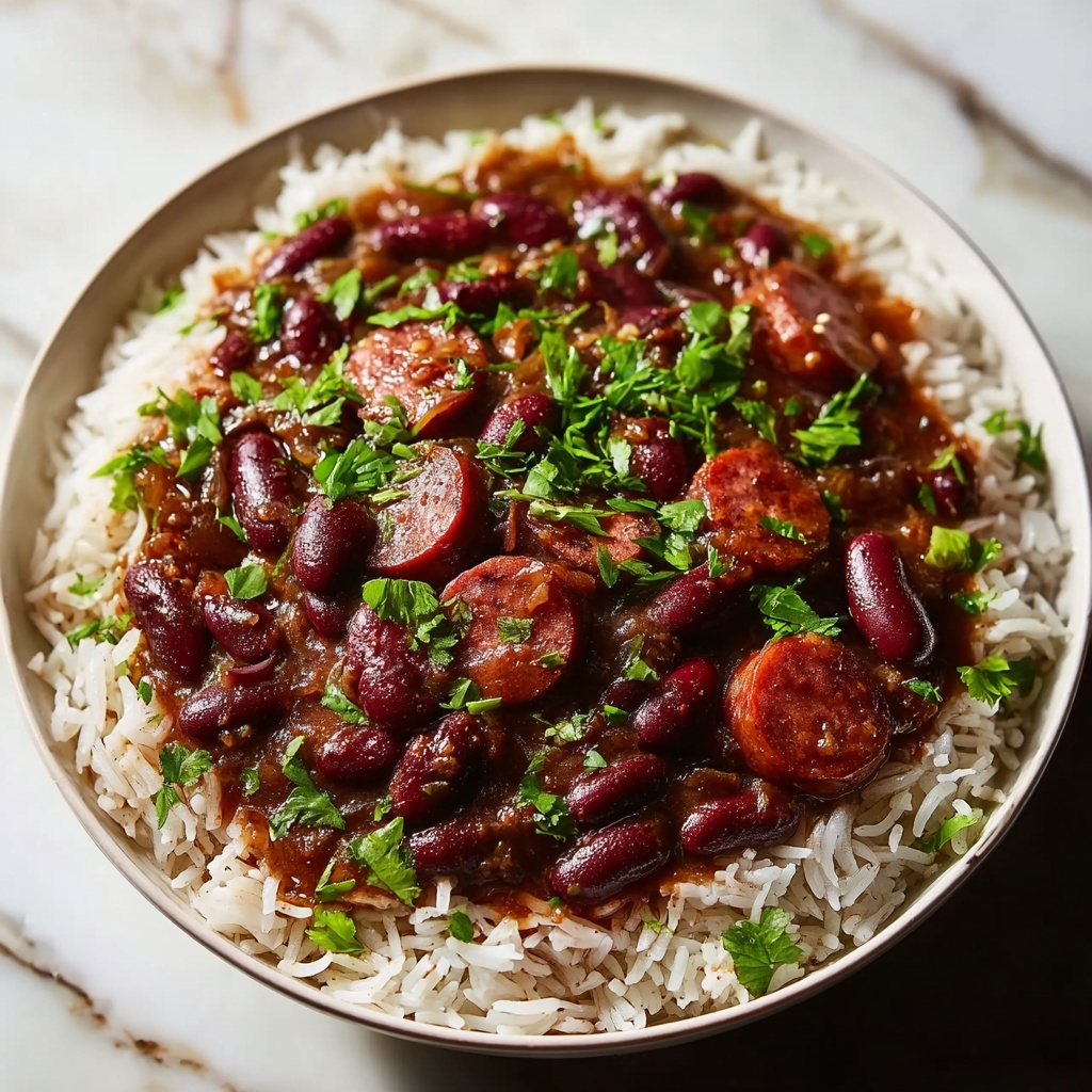 A classic and hearty Creole dish of tender red kidney beans simmered with spicy andouille sausage, aromatic vegetables, and Cajun seasonings, served over fluffy long-grain white rice. Perfect for a comforting family meal with rich flavors and satisfying textures.