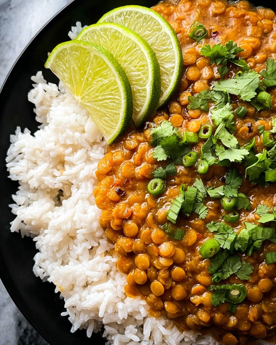 This comforting Red Lentil Dal recipe offers a rich, creamy blend of red lentils simmered with aromatic spices, coconut milk, and fresh ingredients. Perfect as a hearty vegetarian main dish or side, it is infused with the warmth of cumin, mustard seeds, turmeric, and fresh chili, balanced with lime juice and garnished with cilantro and yogurt for a vibrant finish.