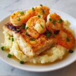 A flavorful Southern-inspired dish featuring tender red snapper fillets and succulent shrimp served over creamy cheesy grits, all topped with a rich Cajun cream sauce. This recipe balances bold Cajun spices with comforting grits, perfect for a hearty dinner.
