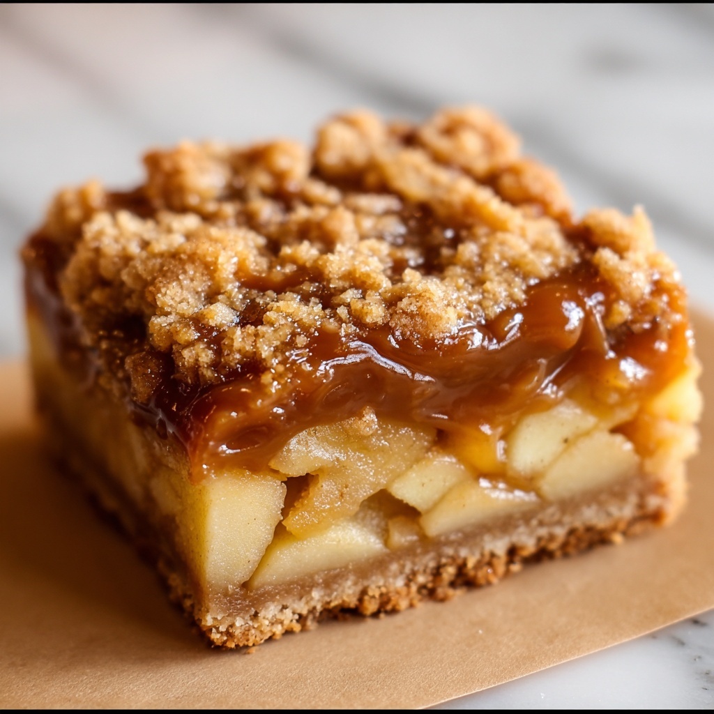 While the crust cools, peel, core, and slice your apples thinly—about 4 cups total. Combine caramel sauce, salt, cinnamon, brown sugar, and flour in a small bowl until smooth, then toss your apples gently in this luscious mixture. This step infuses the fruit with warm, gooey flavor that is the heart of the Salted Caramel Apple Crisp Bars Recipe. Spread the coated apples evenly over the baked shortbread crust and gently press down for an even layer.