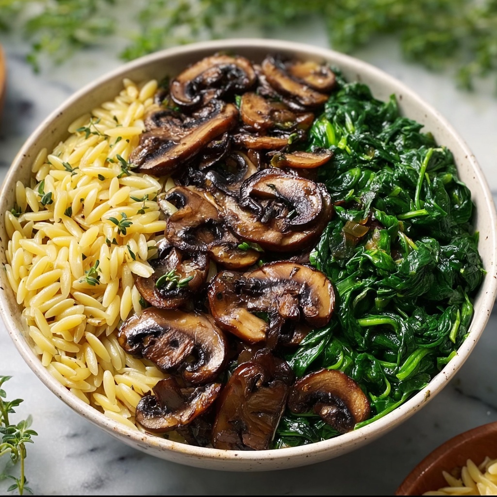 This Spinach Mushroom Orzo is a quick and flavorful vegetarian dish combining tender orzo pasta with sautéed mushrooms, garlic, and fresh baby spinach. Finished with grated Parmesan cheese and optional red pepper flakes and parsley, it’s a comforting and easy meal perfect for any weeknight.