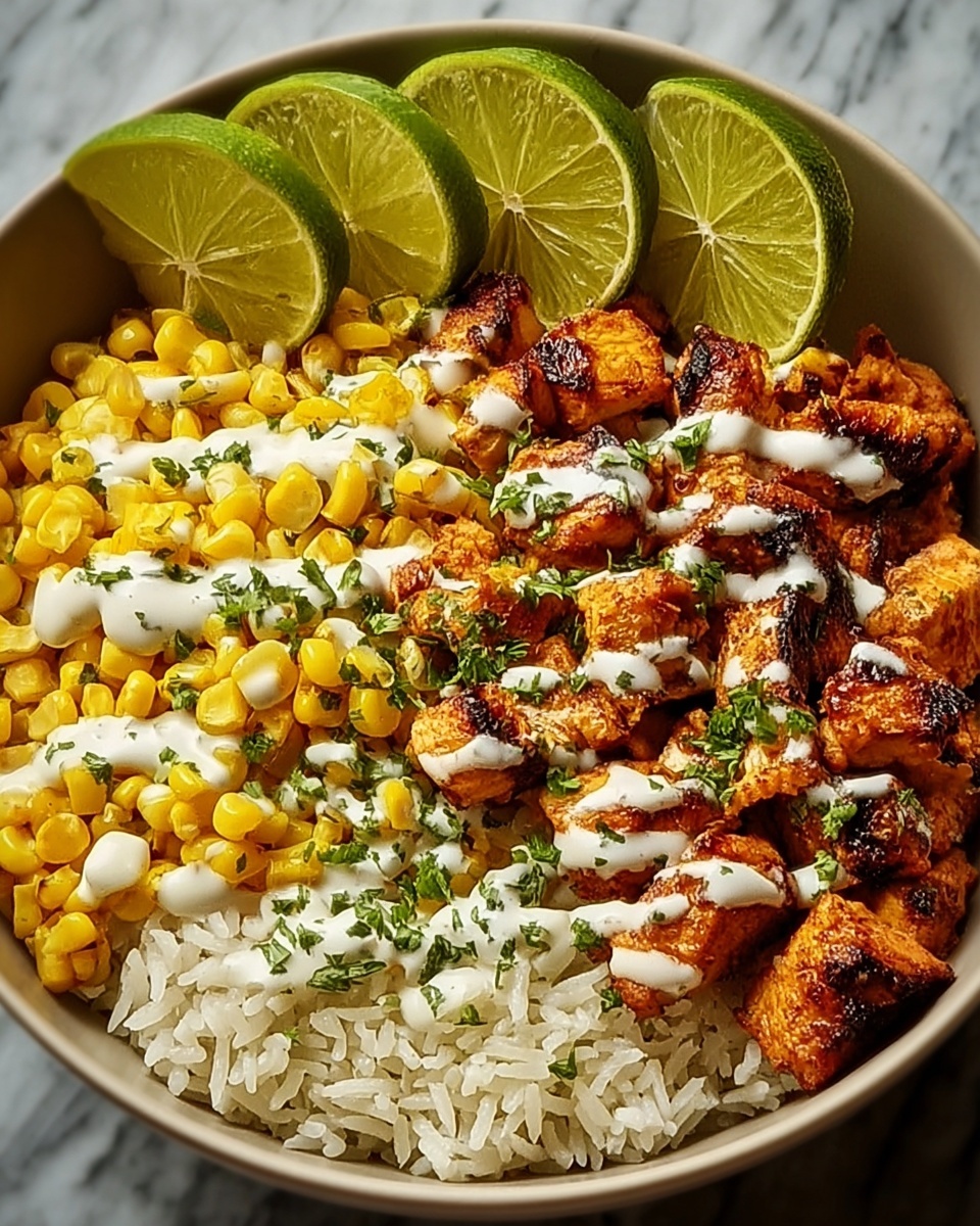 To truly elevate this dish, play with garnishes like a splash of hot sauce for heat, tangy pickled onions for crunch, fresh sprigs of cilantro for herbaceous freshness, and lime wedges for an extra zing of acidity. These little extras bring your Street Corn Chicken Bowl Recipe to life and allow you to customize each serving to your taste preferences.