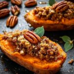 Sprinkle the pecan streusel generously over each stuffed sweet potato half. Return the baking sheet to the oven and bake for another 15 to 20 minutes until the streusel is golden brown, crisp, and irresistibly fragrant. This final step seals the deal and guarantees a perfect sweet and crunchy finish for your Twice-Baked Sweet Potatoes with Pecan Streusel Recipe.
